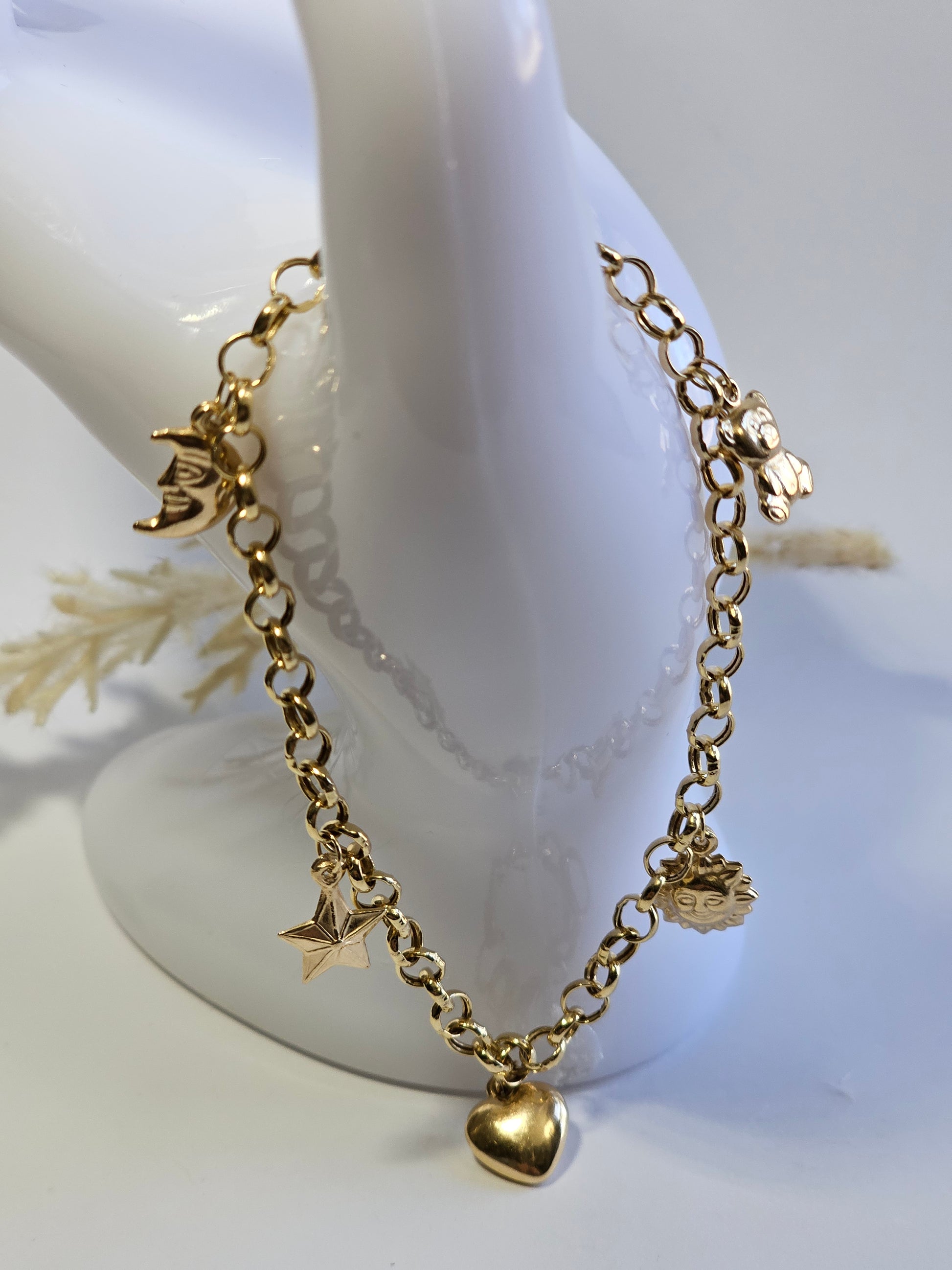 Embellish your wrist with our Brl bracelet. Made of 18k gold and adorned with charming moon, star, heart, sun, and bear elements, this playful accessory will add a touch of whimsy to any outfit. With a length of 19 inches, it's the perfect addition to your jewelry collection.