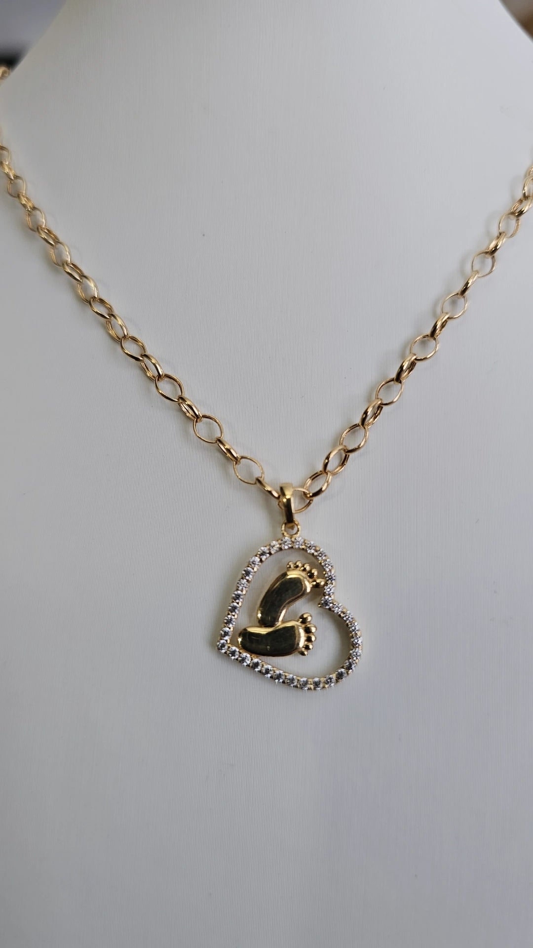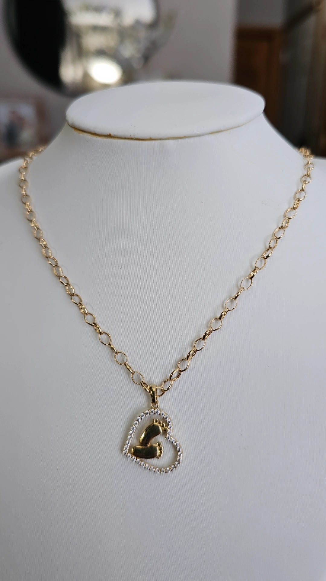 18K Solid Gold Baby Feet Heart Necklace – 18 Inches
