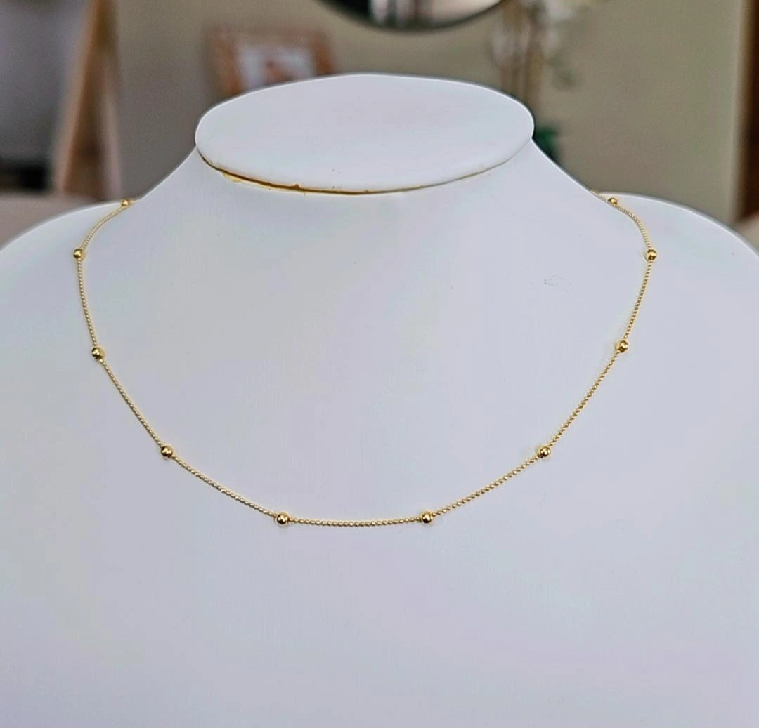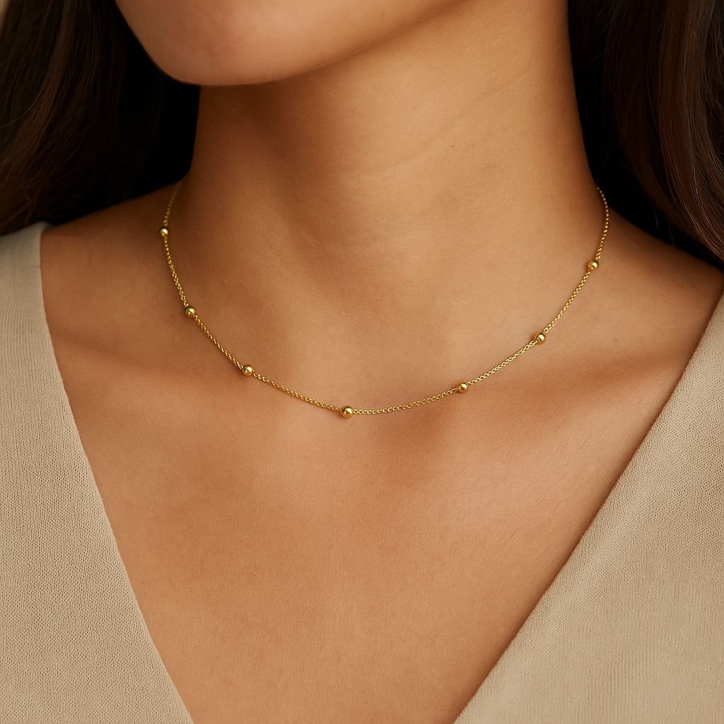 This elegant gold choker features a minimalist chain adorned with evenly spaced, polished beads that add a subtle touch of sophistication. Its delicate design makes it perfect for layering or wearing alone for a refined, everyday look.