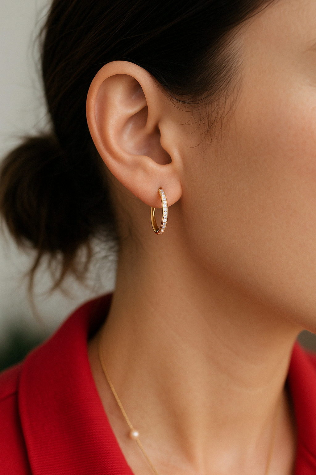 This elegant diamond hoop earring is the perfect blend of timeless design and modern sophistication. Crafted in lustrous gold, the slim hoop is delicately lined with shimmering diamonds, offering just the right amount of sparkle to elevate any look. Its refined size makes it ideal for both everyday wear and special occasions, while the secure clasp ensures comfort and confidence.