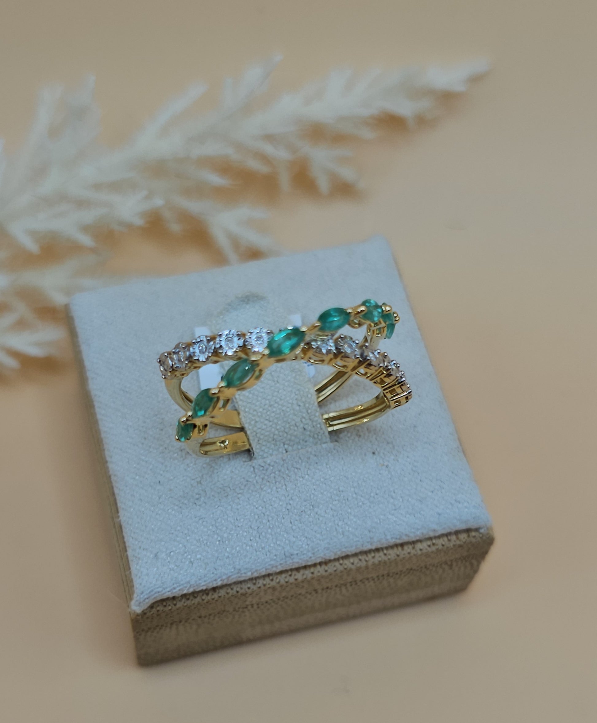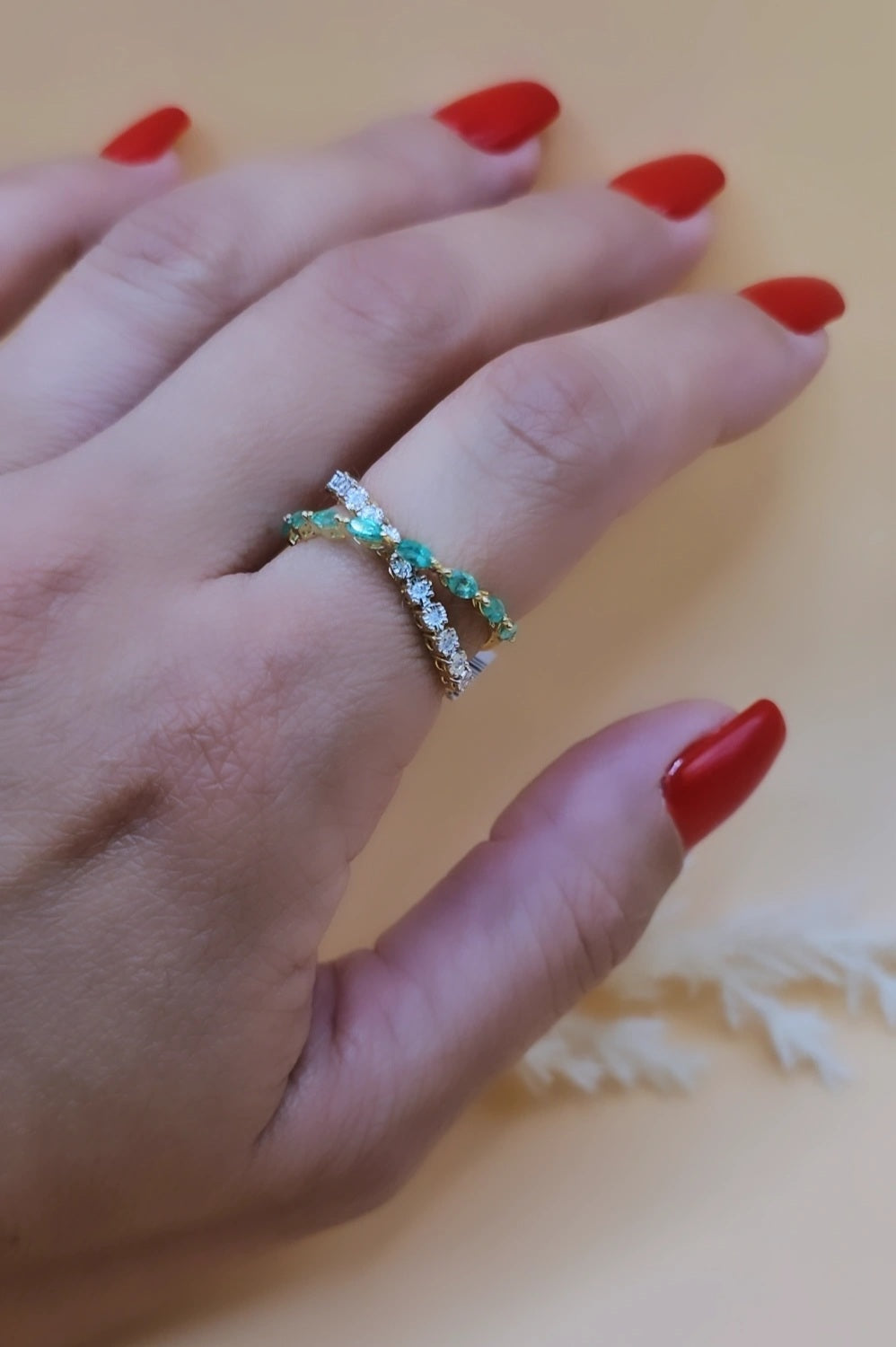 This exquisite emerald and diamond ring features a stunning X design that will dazzle and delight. Add a touch of elegance and style to any ensemble with this beautiful piece. Whether you're dressing up for a special occasion or simply want to add a touch of glamour to your everyday look, this ring is the perfect choice. Elevate your jewelry collection with this gemstone and diamond masterpiece.