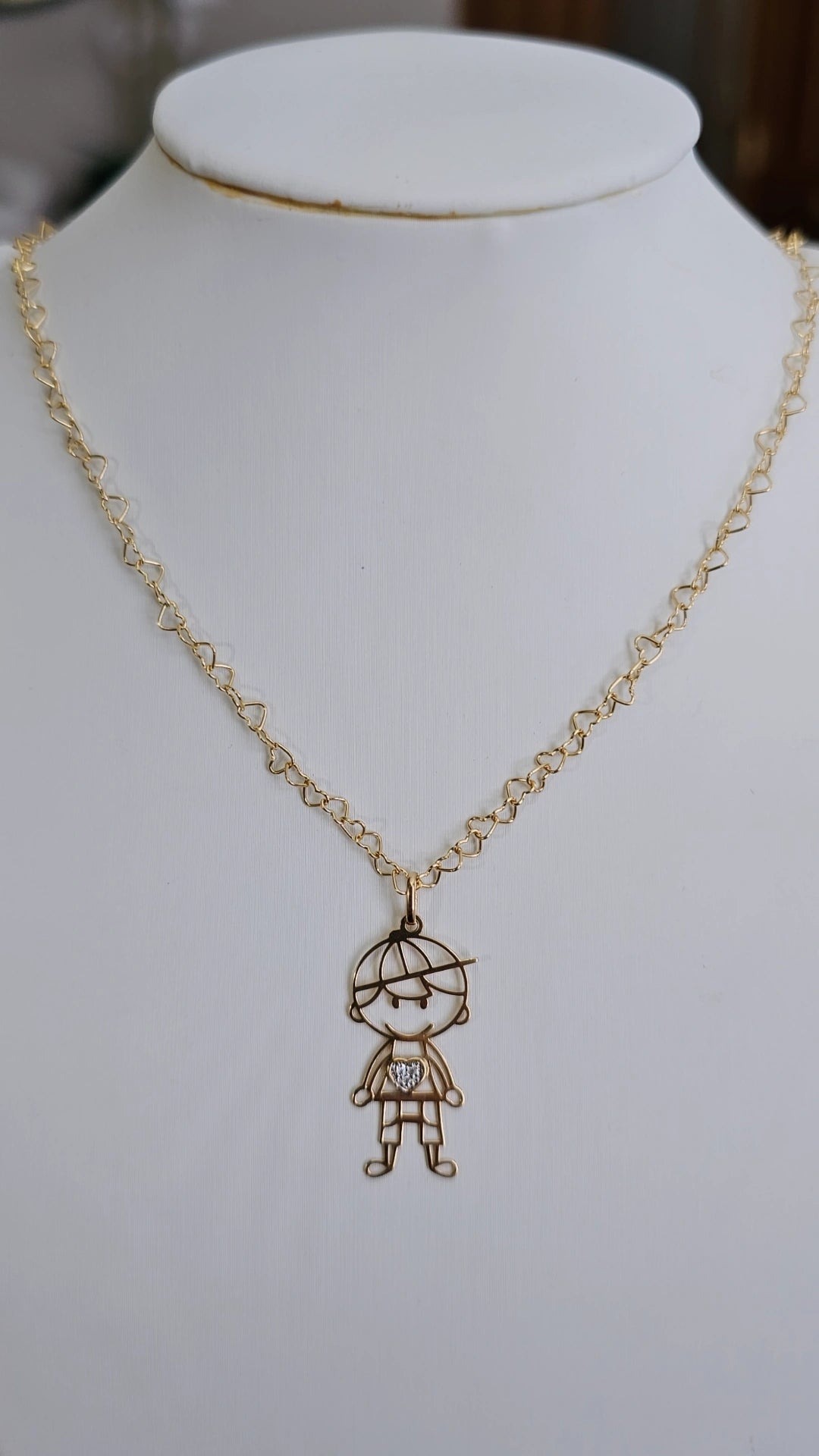 Celebrate the joy of family and childhood with this playful 18K solid gold necklace. Featuring a charming outline of a little boy, this pendant brings a sweet, sentimental touch with a sparkling heart detail at the center—perfect for moms, grandmothers, or anyone cherishing a special boy in their life.