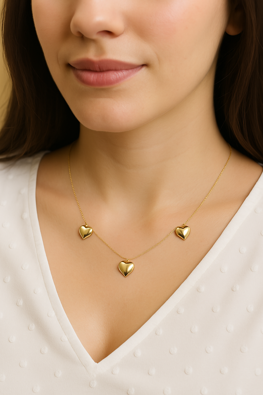 Elegant and timeless, this 18-inch necklace features three beautifully polished heart charms crafted in genuine 18K gold. Each heart rests gracefully along a delicate chain, symbolizing love, warmth, and connection. Perfect for everyday wear or special occasions, this piece adds a touch of romantic charm to any outfit. Whether you're treating yourself or gifting a loved one, this necklace is a stunning expression of affection ❣️