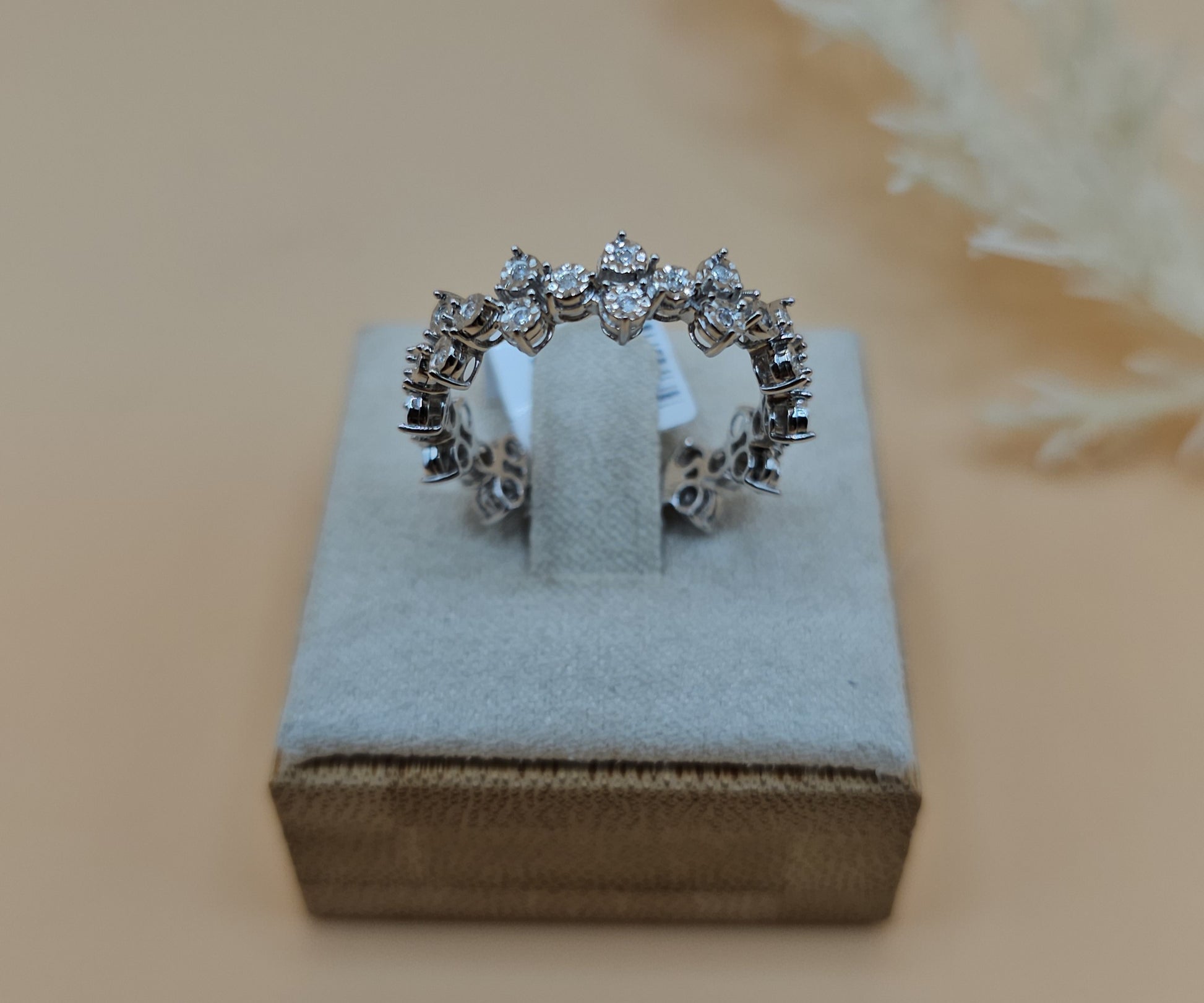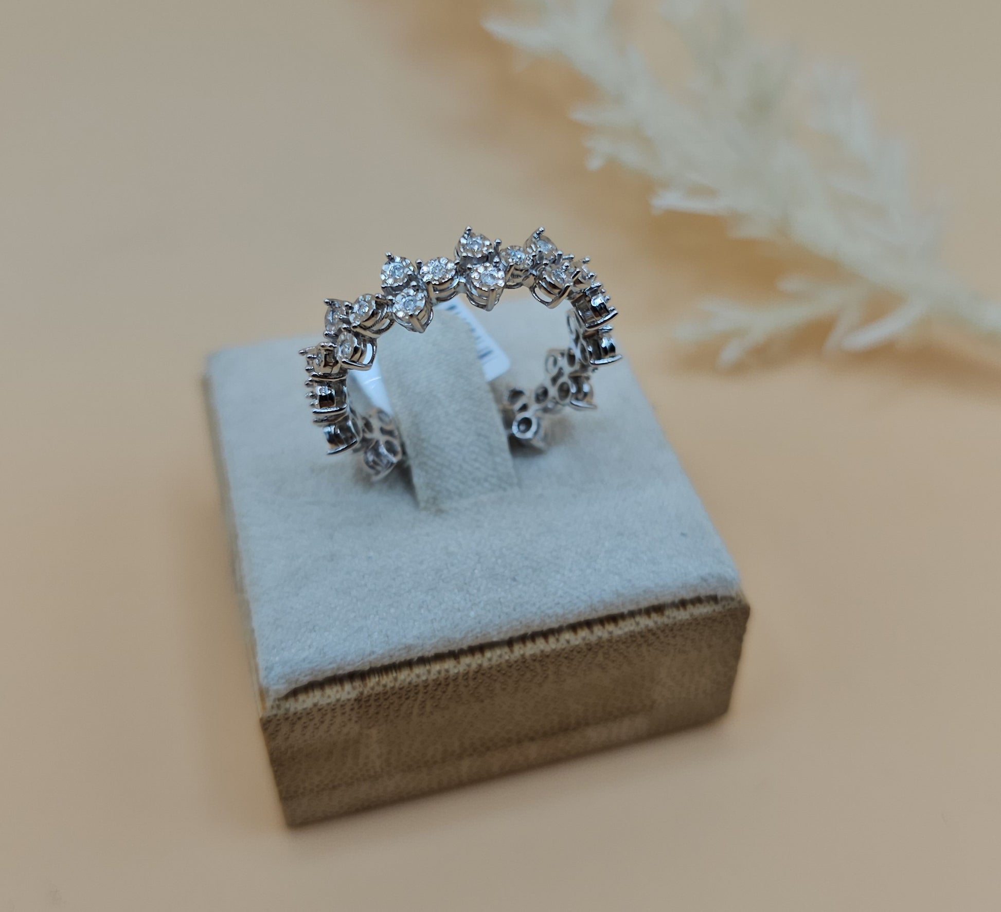 This stunning ring in white gold is beautifully adorned with sparkling diamonds all around, creating a timeless and elegant design. Its floral-inspired setting adds a touch of sophistication and brilliance, making it the perfect piece to wear alone or stacked with other rings. Available on size 8